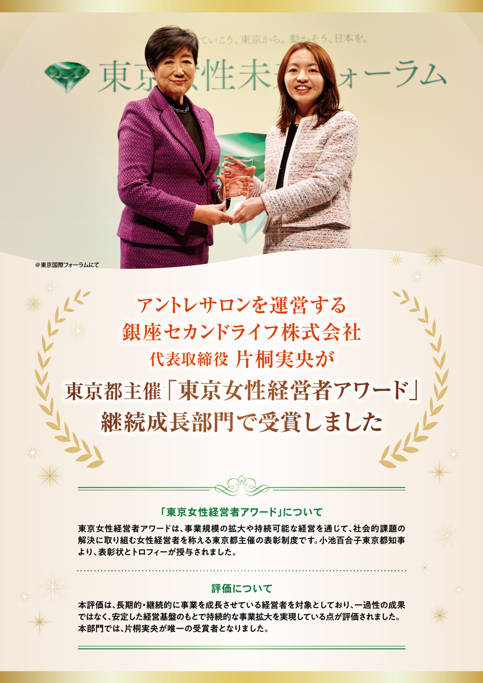 東京都が主催する「東京女性未来フォーラム2026」において、東京女性経営者アワード2026「継続成長部門」を、「アントレサロン」を運営する銀座セカンドライフ株式会社の代表取締役片桐実央が受賞しました!